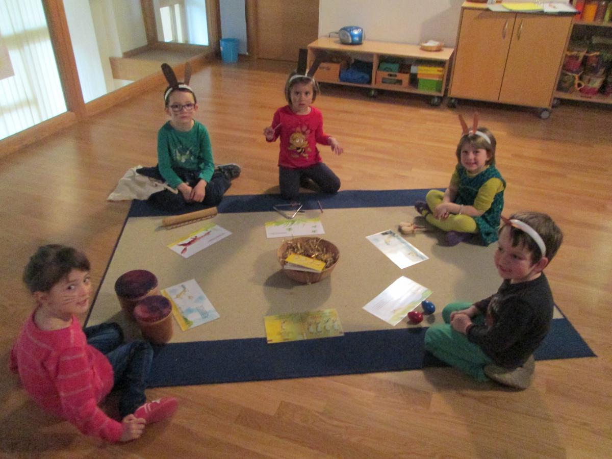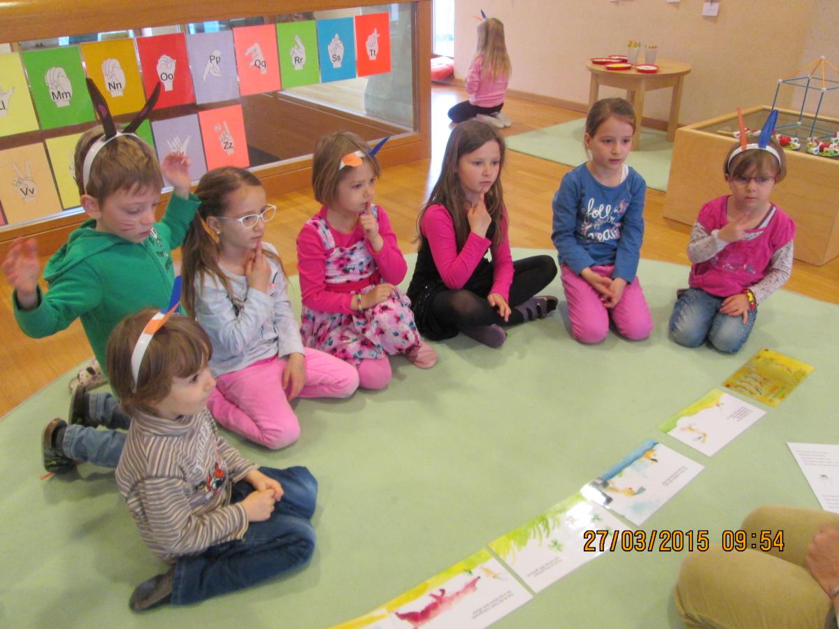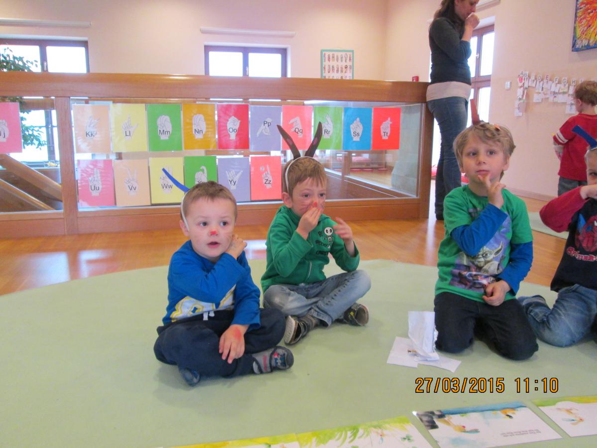 Ob beim Hennenrennen, beim Verklanglichen und Gebärden einer Geschichte, beim Kochen eines Osterhasenspiegeleis, beim Basteln von Hasenohren oder bei der Ostereiersuche im Turnsaal jeder hatte großen Spaß.