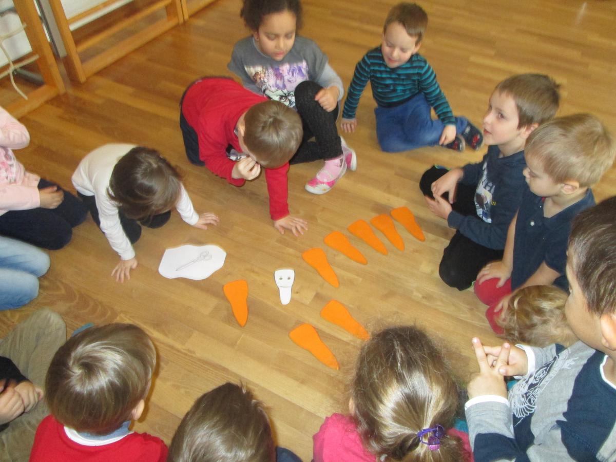 All das wurde bei einem Laufspiel im Turnsaal gelernt. Beim anschließenden Zähneputzen wurden die Zähne noch einmal benannt und gezählt. Dabei konnten die Zähne im Spiegel betrachtet werden.