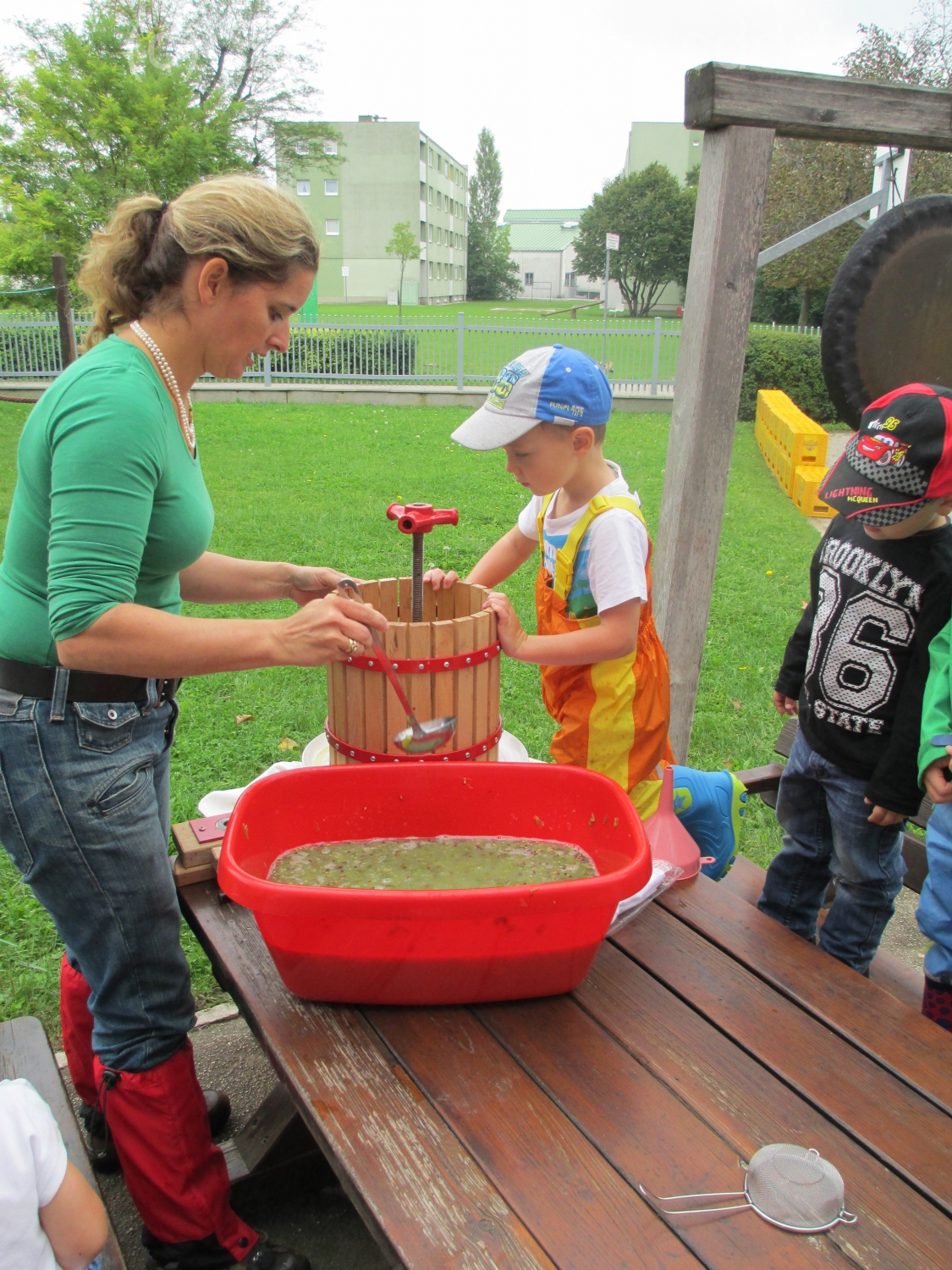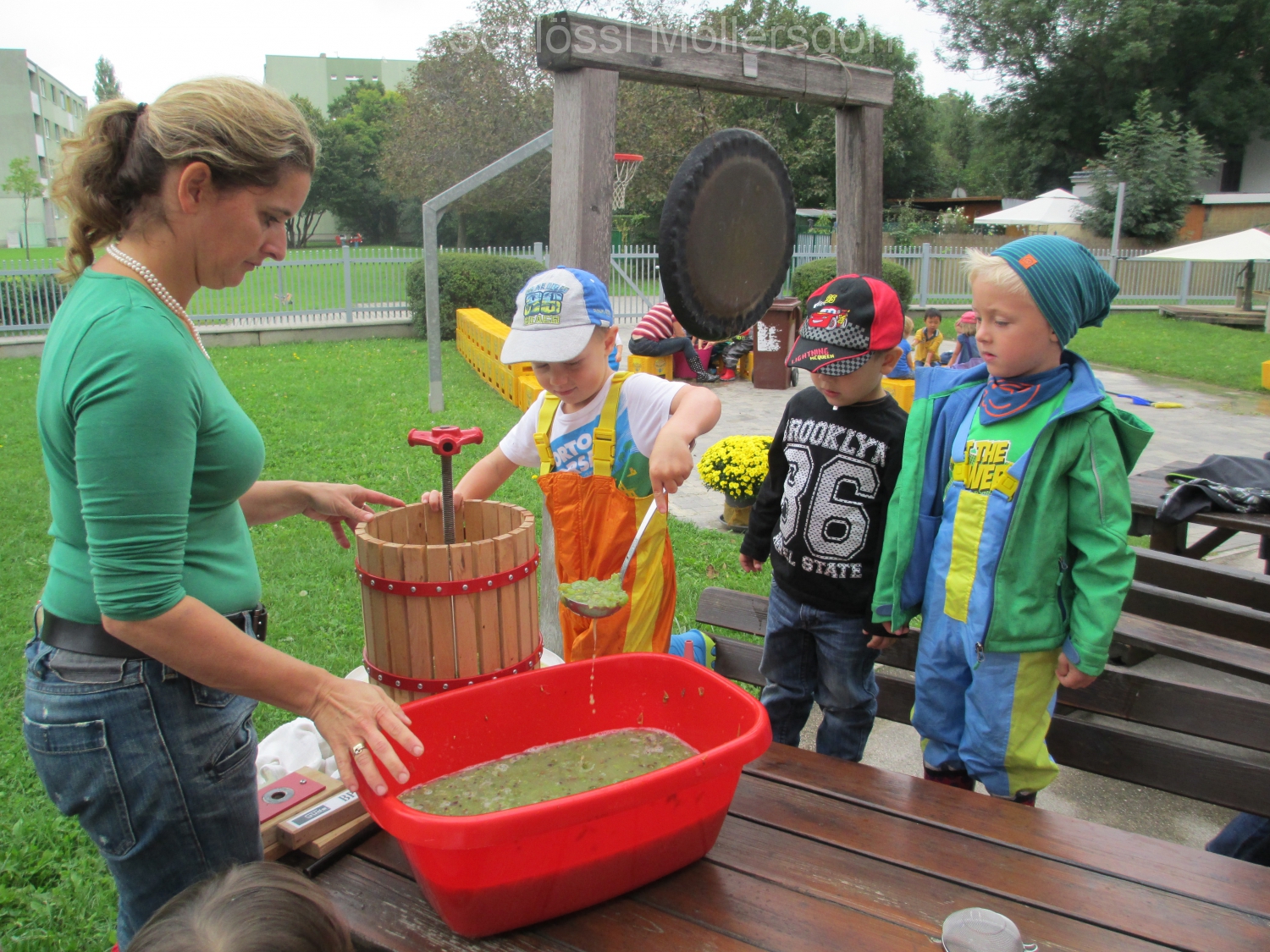 Von der Traube zum Most – dies erlebten unsere Kinder am 16.9.2014. Ausgestattet mit Leiterwagen, Kübeln, Scheren und großen Behälter gingen wir in die Schweitzerstraße zu Familie Ing. Breyer zur Weinlese. Als all unsere Behälter gefüllt waren kehrten wir zurück zum Kindergarten und machten uns an die Verarbeitung der Trauben. Es war gar nicht so einfach die einzelnen Trauben von der Rispe zu pflücken. Weißt du, dass du ganz viel Kraft in den Fingern brauchst um die einzelnen Trauben zu zerquetschen. Erst dann können sie in die Presse geschöpft werden. Fertig verarbeitet wird unser selbst hergestellter Most in Flaschen gefüllt und von uns verkostet.